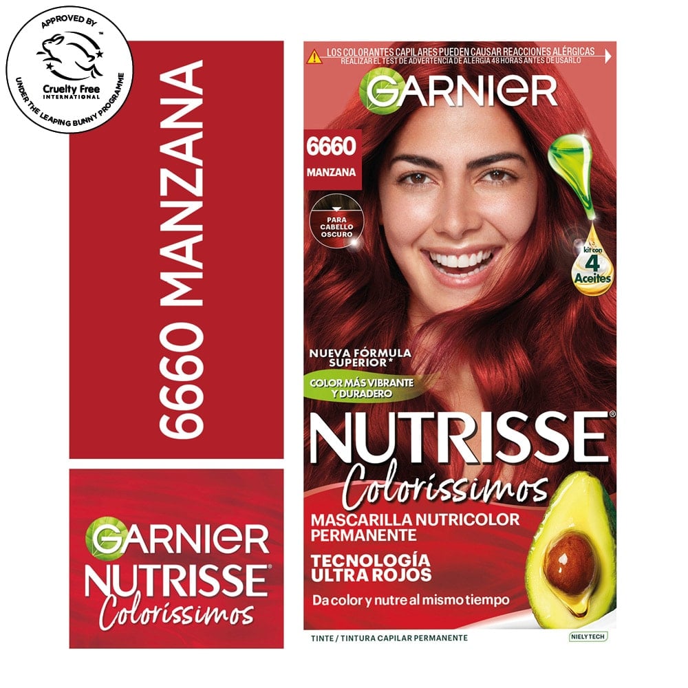 Con Garnier Nutrisse Coloríssimos, cabello nutrido es color intenso y duradero. Nutrisse Coloríssimos está enriquecido con todo el poder de 4 aceites (palta,grosella, oliva y uva). Con su tecnología especial para cabello oscuro, obten colores intensos, radiantes y duraderos.